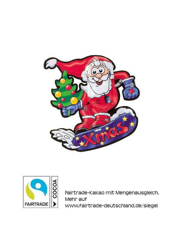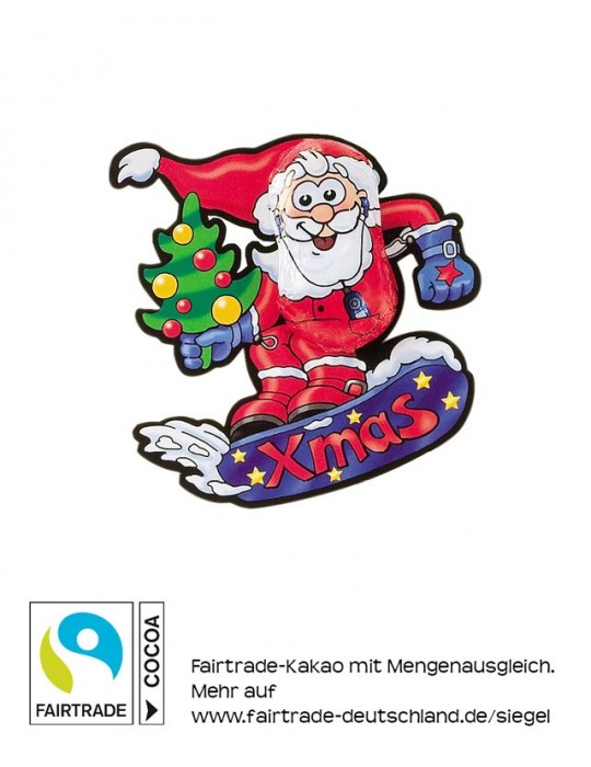 Schokoladen-Snowboard-Santa in bedruckter Folie. Fairtrade Edelvollmilchschokolade, mindestens 33% Kakao.