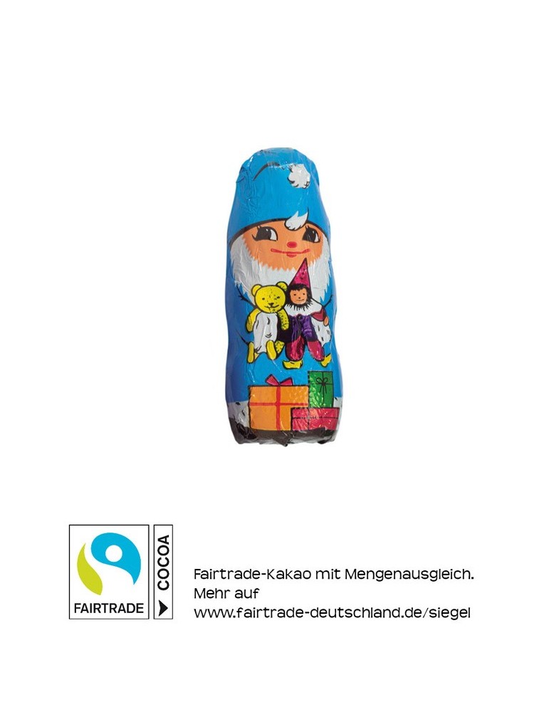 Schokoladen-Wichtelmännchen in bedruckter Folie. Fairtrade Edelvollmilchschokolade, mindestens 33% Kakao.