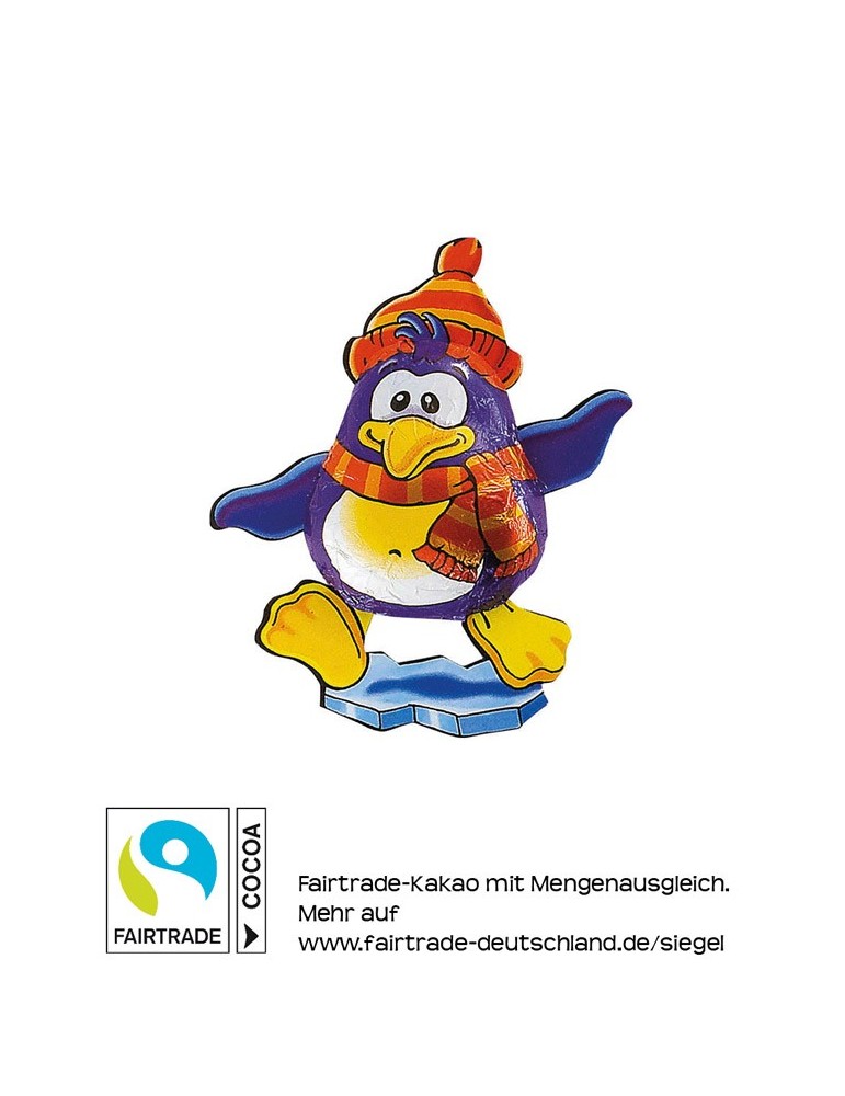 Schokoladen-Pinguin on the rocks in bedruckter Folie. Fairtrade Edelvollmilchschokolade, mindestens 33% Kakao.