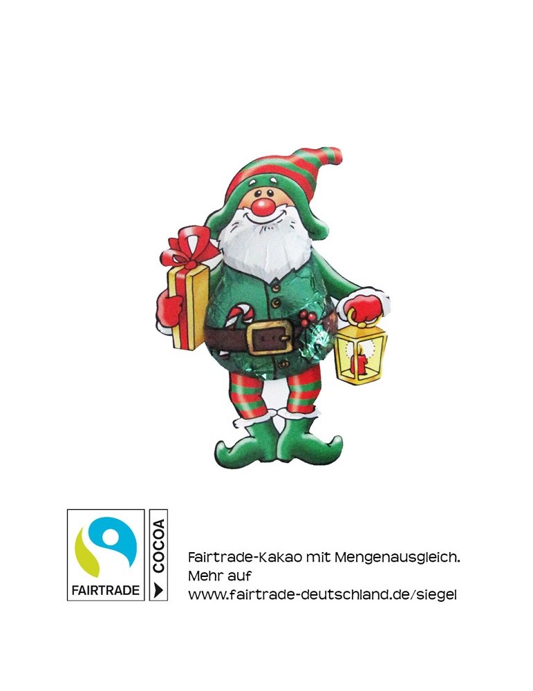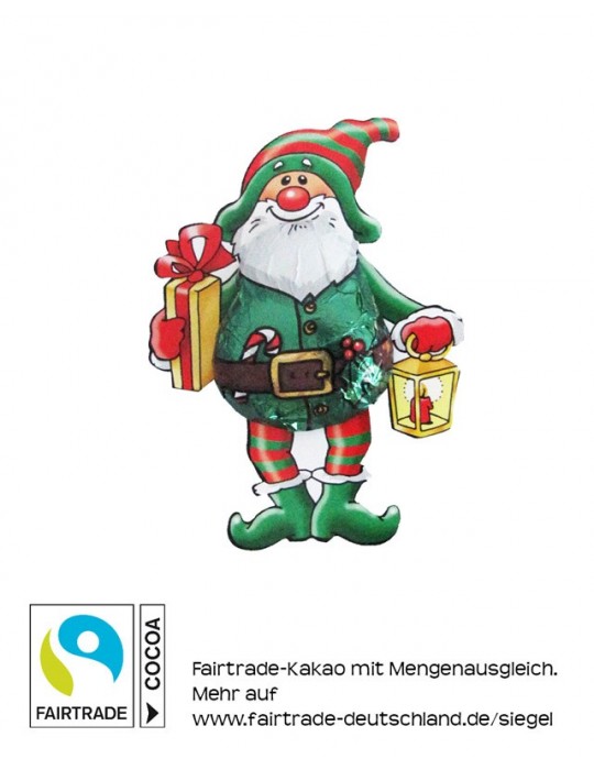 Schokoladen-Wichtel Didi in bedruckter Folie. Fairtrade Edelvollmilchschokolade, mindestens 33% Kakao.