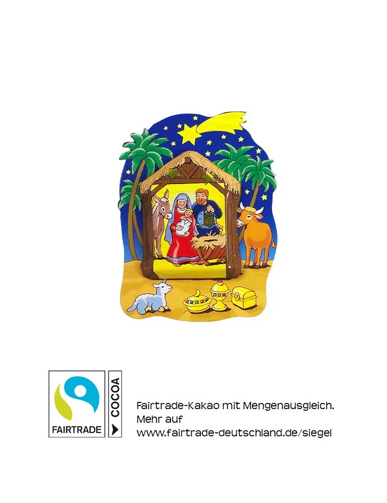 Schokoladen-Weinachts-Krippe in bedruckter Folie. Fairtrade Edelvollmilchschokolade, mindestens 33% Kakao.